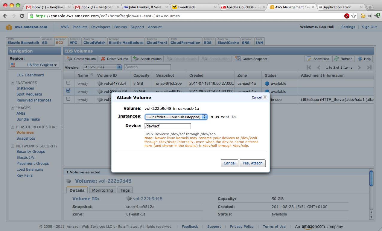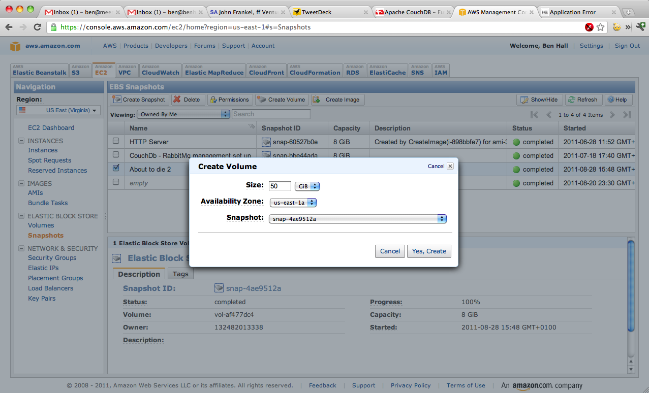 SNAPSHOT snap-020cce62 vol-af477dc4 pending 2011-08-20T22:30:05+0000 132482013338 8 Moved to small 20/Aug/2011